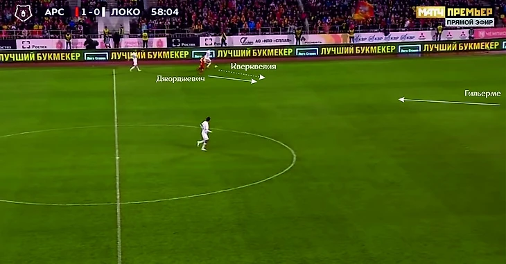 Второй гол "Локомотив" устроил себе самостоятельно. Кверквелия отпасовал назад вышедшему из ворот для передачи Гильерме.