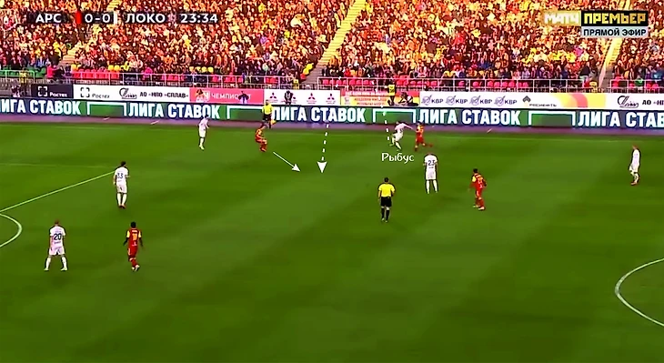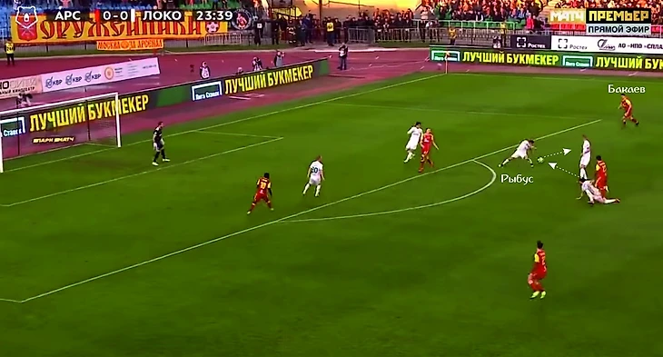 Черногорец отдаёт мяч Горбатенко, тот - прорывающему на фланге Бакаеву. Чей фланг? Правильно, Рыбуса. Зачем он пошёл в центр, где Горбатенко уже накрывали двое? Правильно, незачем. Хотел по-быстрому искупить грешок после потери, а только усугубил ситуацию. Пас на Бакаева Рыбус едва зацепил ногой, но Бакаеву это не помешало в касание классным ударом послать мяч в дальний угол.