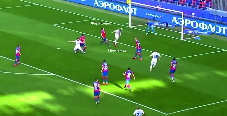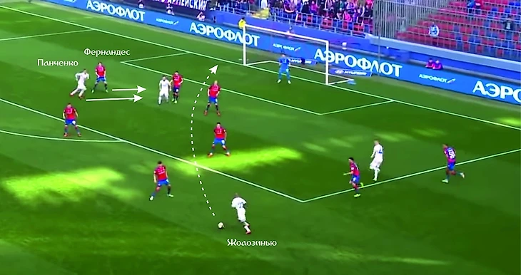 Жоаозинью делает прекрасную передачу на Панченко, и тот без помех со стороны Фернандеса отправляет мяч в ворота.