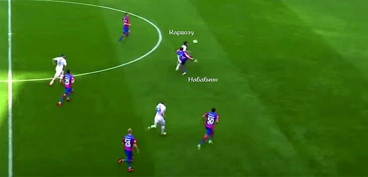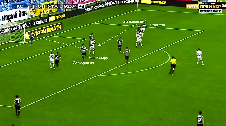 Наигранная комбинация. После подачи штрафного с левого фланга, Никитин выигрывает мяч и сбрасывает его в центр на Неделчяру. Высоченного Никитина держит 170-сантиметровый Зиньковский, потому что это его зона. Я так считаю, что если опасный игрок соперника сместился в зону маленького игрока, то обороне надо перестроиться, да и вообще не дело отряжать Зиньковского кого бы то ни было опекать при подачах. А вот Самарджич обязан был сыграть со "своим", и вина в голе только его.