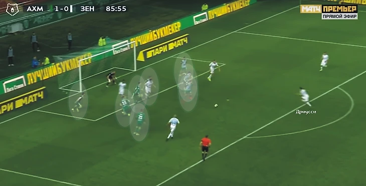 Дриусси один получает мяч. Толпа игроков "Ахмата" оказывается бессильна против своей потрясающей самоотверженности. Правильно, что "Зенит" наказал "Ахмат" за такую дичайшую игру - такого в футболе быть не должно. Вину, строго говоря, должны нести практически все, но Дриусси забивает из зоны опорного полузащитника, так пусть Швец и подвергся общей панике, но помешать Дриусси он должен был. Собственно, он первый, кто пытался это сделать.