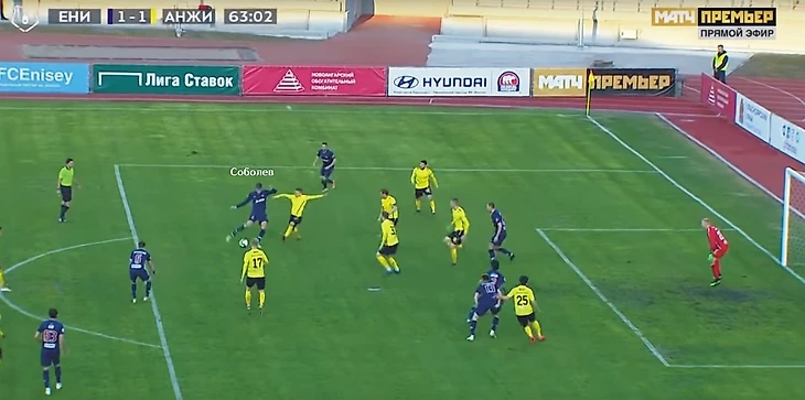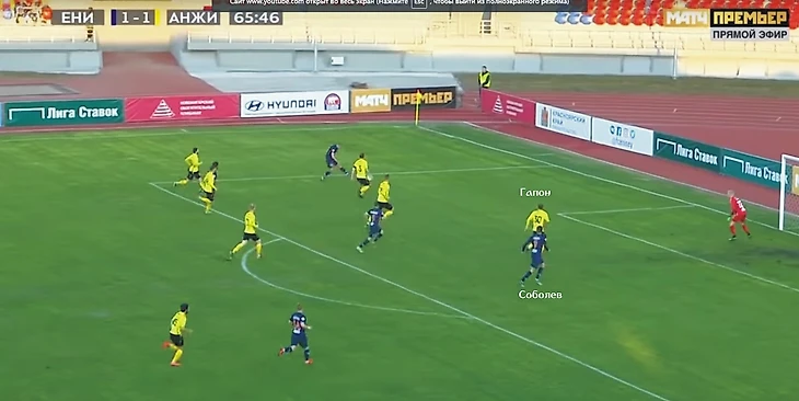 Соболев же и вывел "Енисей" вперёд. После передачи Кутьина Соболев остался один перед воротами, Гапон, вероятно, пытался и Соболева перекрыть, и второго нападающего взять, если мяч пойдёт к нему.