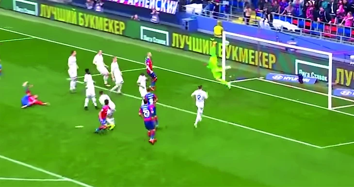 Нисимуру, видим, опекает Марков. Негр на фоне только зрительно находится с японцем, на деле он держит Эрнандеса. Нисимура невероятным ударом головой отправляет мяч в ворота, а Маркову надо поучиться плотнее держать "своего".