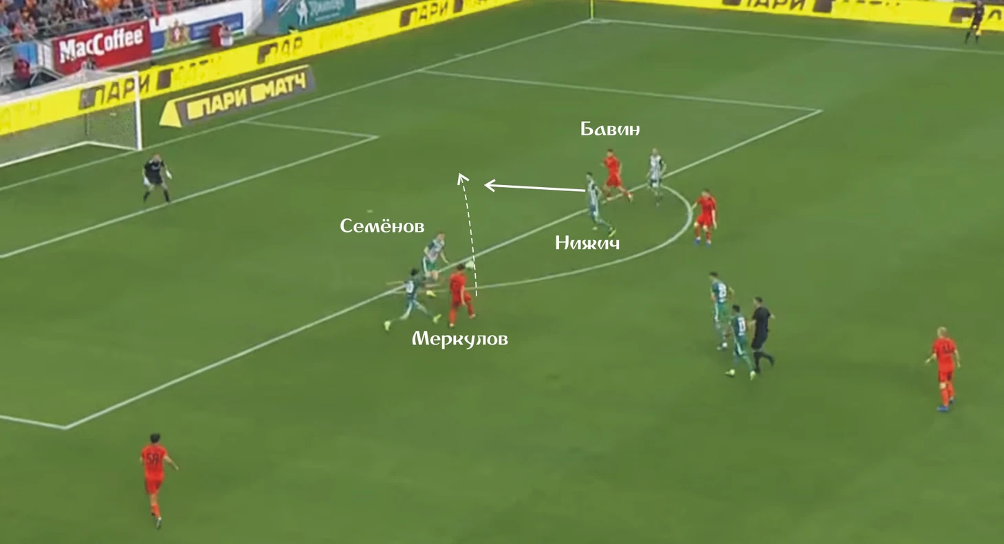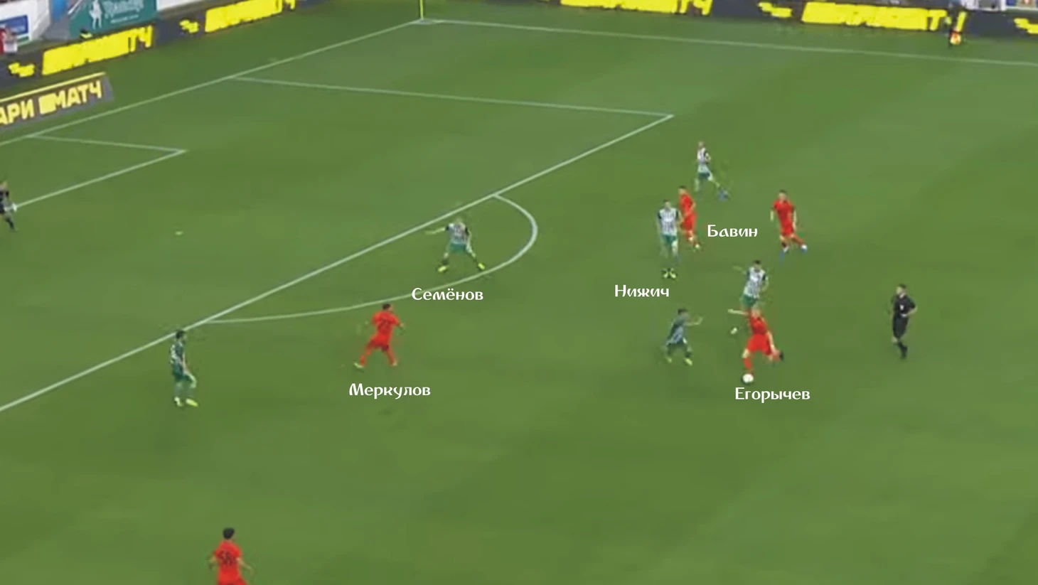 Семёнов поздно спохватился закрывать Меркулова, который прибежал именно в его зону - напомню, Семёнов играл правого центрального защитника. А самый центральных из тройки центральных Нижич помогает "Уралу" оформить разгром, запуская Бавина за спину.