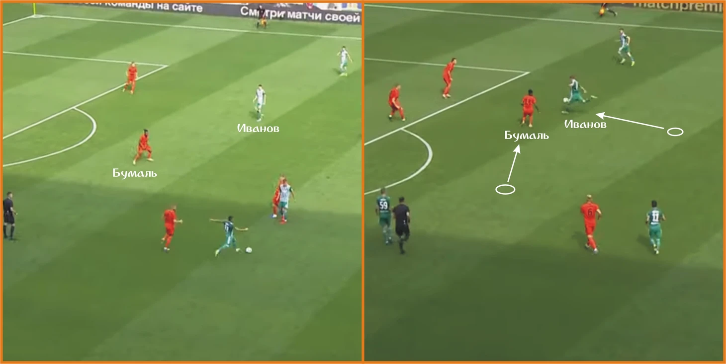 Первый более-менее опасный удар состоялся в ворота "Урала". Это Иванов, получив мяч, успел посмотреть, размахнуться и с ленцой ударить в створ. На кадре видно, что у Бумаля было много времени, чтобы закрыть Иванова и хотя бы начать мешать ему, но желания этого делать у Бумаля было на грош.