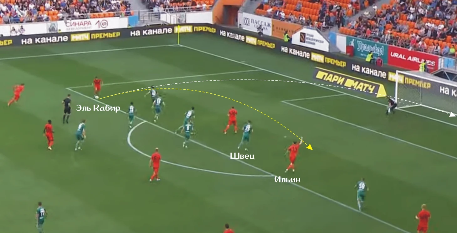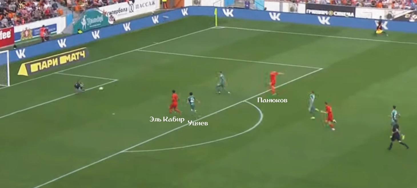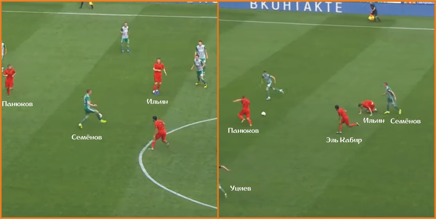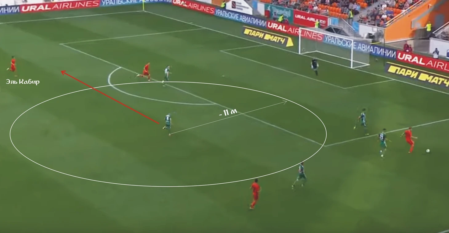 Эль Кабир, который в защите в предыдущем моменте участвовал только взглядом, оказался в свободной зоне и готов получить мяч. Понятно, что Уциев умчался в атаку и не успевает, но для страховки есть опорные полузащитники как Шиманьски, чтобы накрыть, как здесь, фланг, однако поляк бежит безо всякого смысла в полнейшем одиночестве вместо того, чтобы лететь на фланг к Эль Кабиру. К счастью для "Ахмата", удача продолжает им помогать и передача на фланг получилась очень неудобной. Но дальше больше.