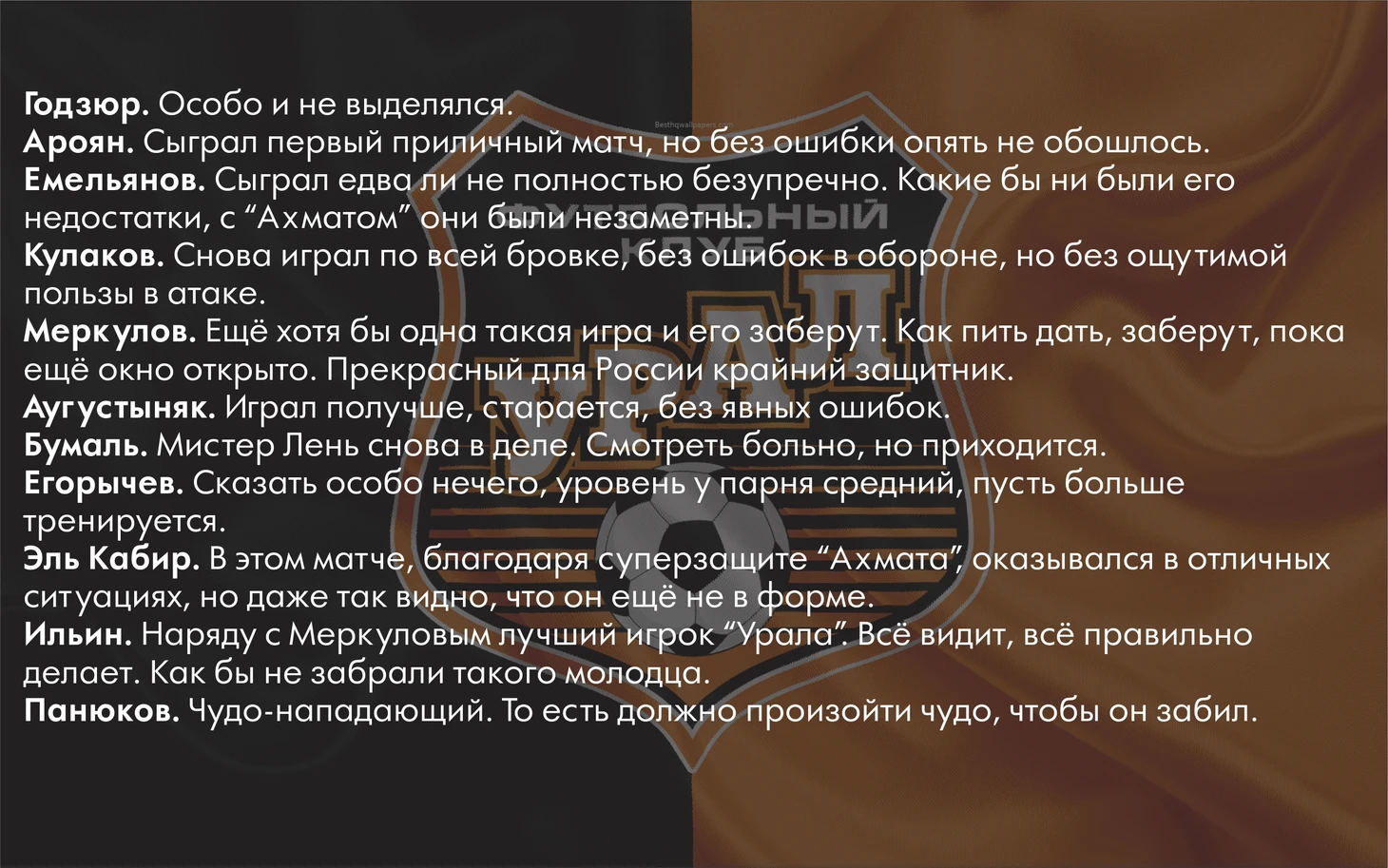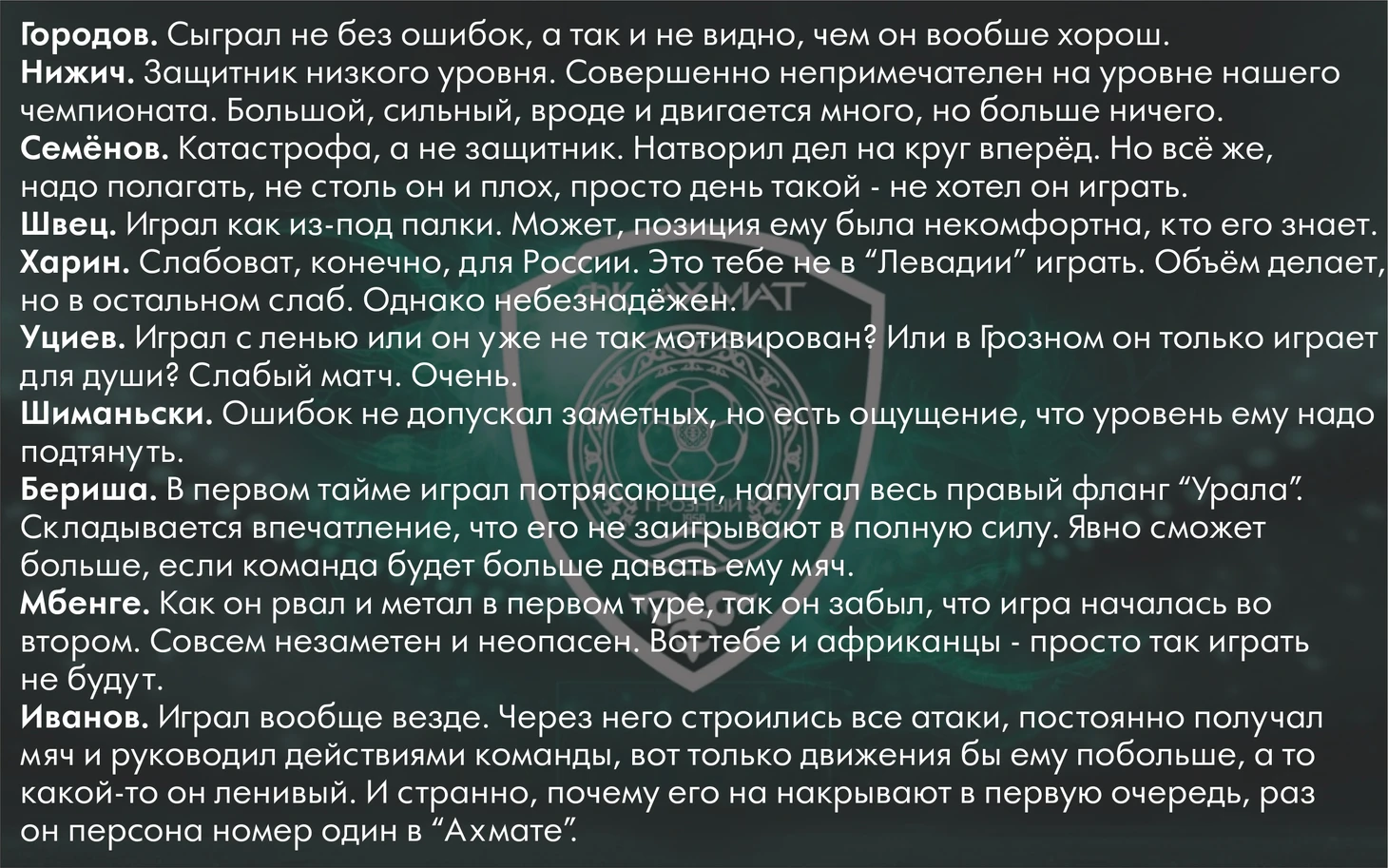"Ахмат" хоть и провалил игру в обороне, выглядел в начале игры лучше и мощнее, но "Урал" оказался умнее в атаке и дисциплинированнее в каждой линии.