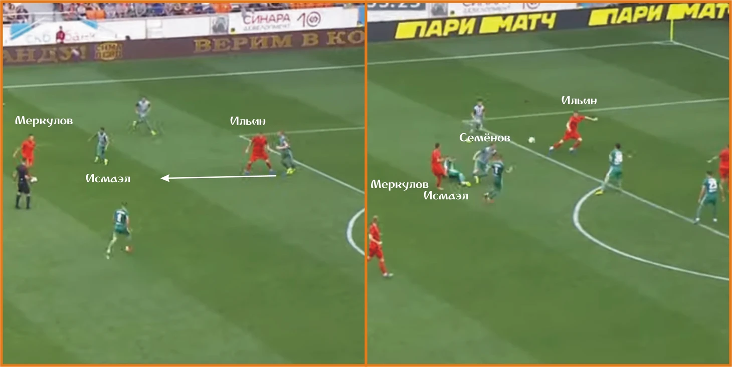 Меркулова контролирует Исмаэл, Семёнов держит Ильина, но защитник, видно, решил, что его бразильский одноклубник недостаточно активен и уверенно выбежал на Меркулова. Как следствие, Ильин забегает в штрафную и свободно получает мяч. Удача снова на стороне "Ахмата" - "Урал" момент не реализовал.
