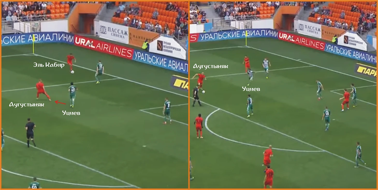 Эль Кабир таки получает мяч, прибегает, наконец, Уциев, и, видя свободного Аугустыняка, бросает того и решает идти помогать защитнику на фланге. Следствием оказывается пас Аугустыняку, который без помех бьёт по воротам и пропадает в перекладину. Уциев совершенно не похож на себя прежнего, удивительная расхоложенность.