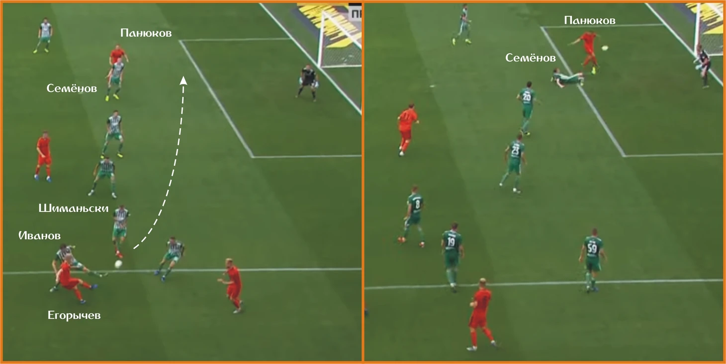 Вскоре уже, как говорят, "стопроцентный" голевой момент возник у ворот расхоложенного "Ахмата". Видим, как Иванов с Шиманьским изображают оборону в то время как Егорычев отдаёт зрячий пас на Панюкова.