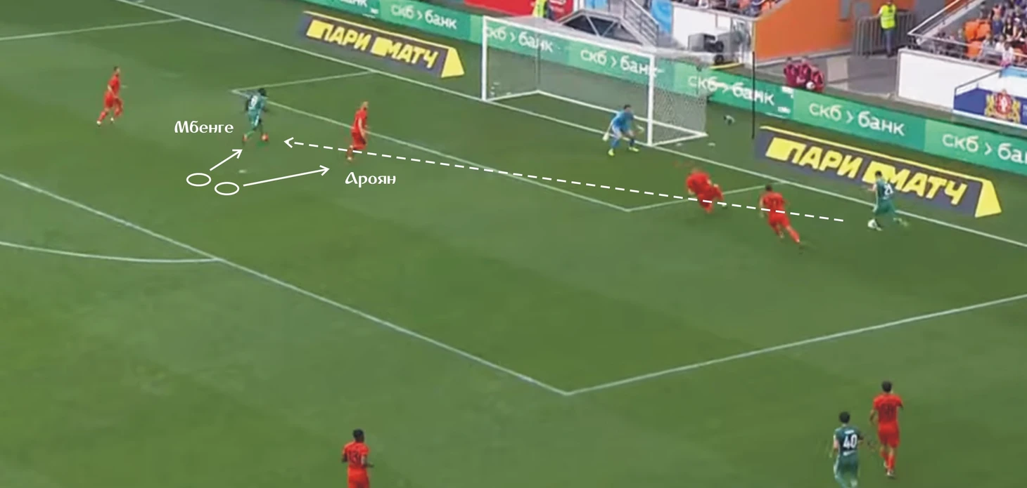 Мбенге бежит на прострел, а вот Ароян вместо того, чтобы контролировать сенегальца, принимает решение бежать на фланг "от своего". Зачем Ароян туда побежал? Он думал, что сделав несколько шагов гарантированно перекроет всю зону прострела? Кошмар! Пас на Мбенге идёт прямо между ног Арояна и это, скажу я, слава богу! А то ещё бы себе забил в попытке вынести мяч. К счастью для "Урала", Мбенге чуть неправильно сориентировался и слишком забежал вперёд, потому удар у него совсем не вышел. Арояна по-человечески понять можно. Он видит, что прострел будет и летит его перекрывать, но! Но ты же профи как будто бы! Защитник должен всегда видеть где нападающий и занимать позицию именно сообразно этому, чтобы оценить возможную траекторию передачи.