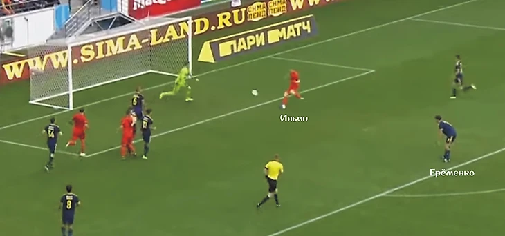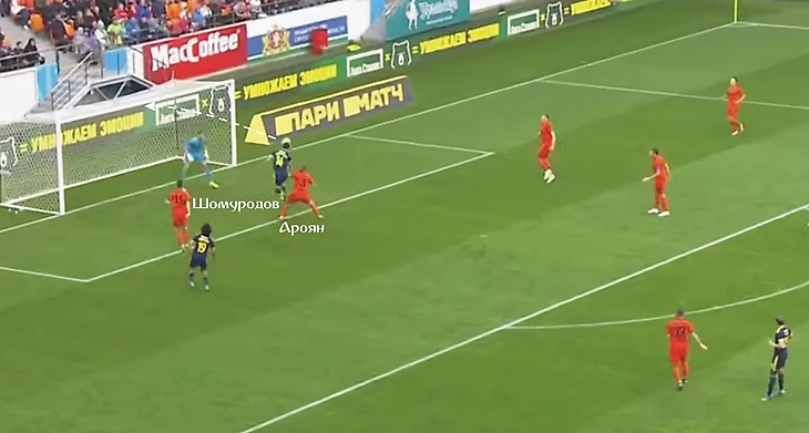 После передачи с фланга Ароян даже не стал бороться за мяч, очень неверно оценив ситуацию и думая, что Годзюр должен быть первым на мяче. Шомуродову осталось только прыгнуть и без борьбы переправить мяч в воротам, но он попал в перекладину. Пас, конечно, отдавал Ерёменко.