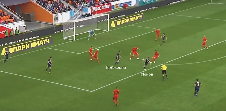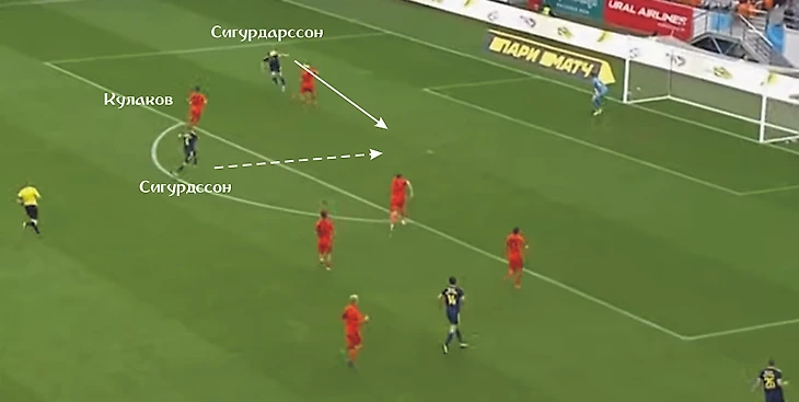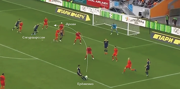 На кадре видно, как Ерёмекно отдаёт пас Сигурдарсону за спину Арояну. Дежавю: Ерёменко никто не мешает, Ароян упускает игрока. Кулакову бы проследить за подключившимся Сигурдссоном, но он просто не видит исландского защитника, и оборачивается на него уже когда время потеряно.