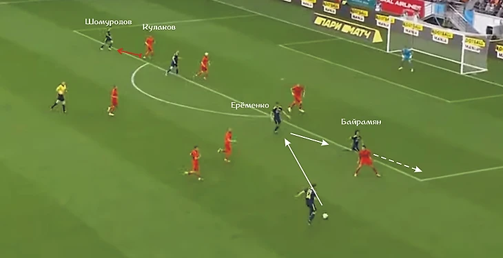 67-я минута. Манера оставлять Ерёменко без опеки привела к голу. Козлов, Ерёменко и Байрамян без помех разыгрывают мяч в касание, как на тренировке. Бавин, который перешёл играть на левый фланг вместо Эль Кабира, унаследовал от того только нежелание обороняться. Как видим, Бавин, вместо того, чтобы защищаться против флангового защитника Козлова, ограничился наблюдением. Меркулов из-за этого оказался в полупозиции, пустив за спину Байрамяна, который сделал в итоге голевой пас.