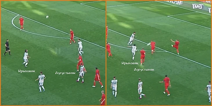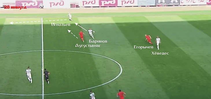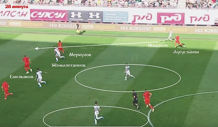 Второй гол начинается с провала на фланге. Игнатьев остался один, поскольку действующий против него Егорычев решил прессинговать защитника и не особо успешно. Крайний защитник Меркулов остался на своей половине, так как Жемалетдинов сместился к флангу и тем самым "обязал" Меркулова стоять на месте. Аугустыняку остаётся бросить Баринов и мчаться за Игнатьевым, но тоже без успеха.
