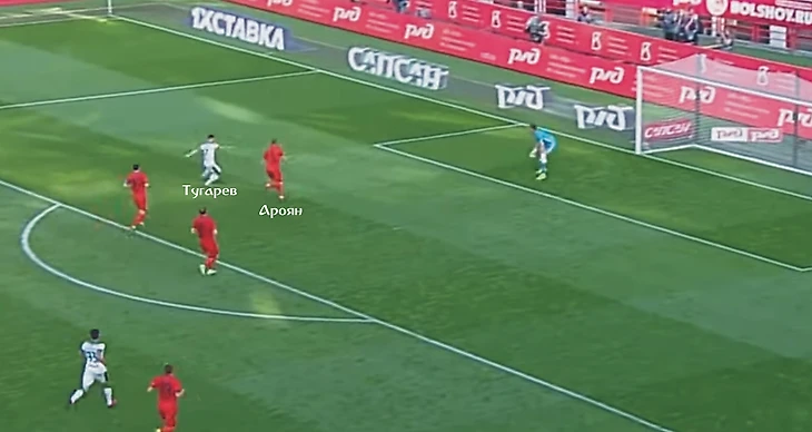 Ароян даже не мешает! Да тут я с мячом был бы опасен, а перед ним профессиональный футболист, но он и в ус не дует! Типа, уже 4:0, вот разница-то! Но увы, Тугарев потому и сидит в запасе, что вот такие подарки от соперника не использует.