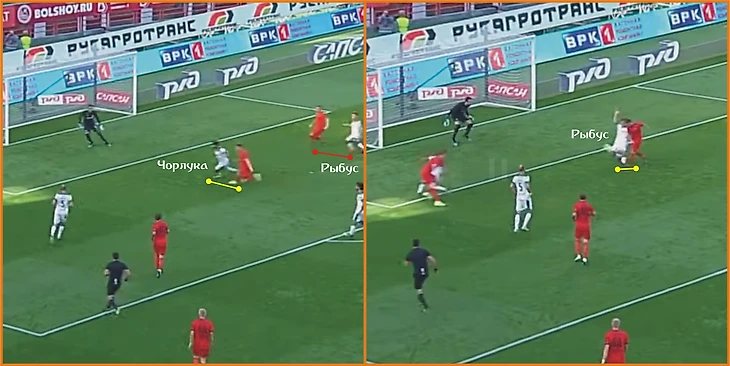 Почему же у "Урала" не было опасных моментов? Потому что защитники "Локомотива" действуют совсем по-другому. На кадре ниже не видно - на левом фланге атаки футболист "Урала" делает прострел, Чорлука сразу идёт на опережение и не даёт ударить по мячу. Кажется, будто Рыбус упускает "своего", но после того, как мяч пролетает дальше, поляк делает своё дело, бросаясь под ноги Ильину, чем отводит угрозу от ворот. Надо футболистом "Урала" немного посмотреть этот матч, поучится у настоящих футболистов.