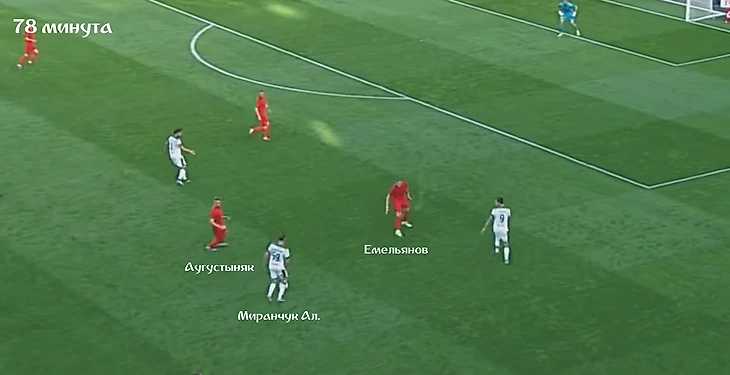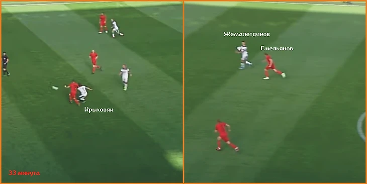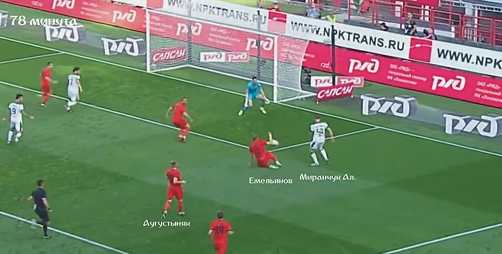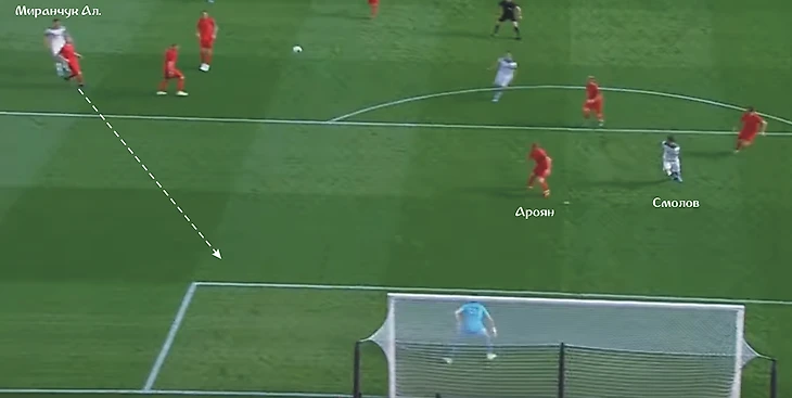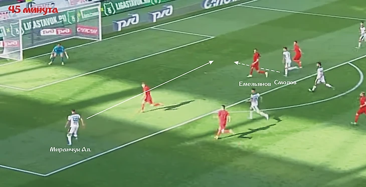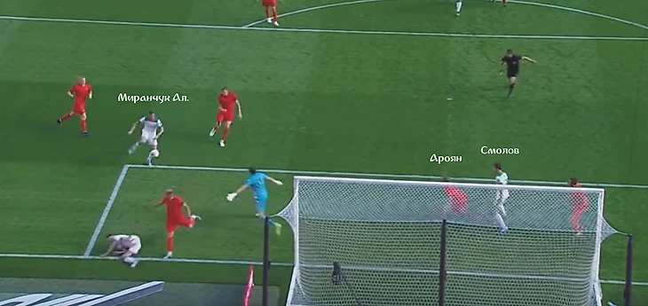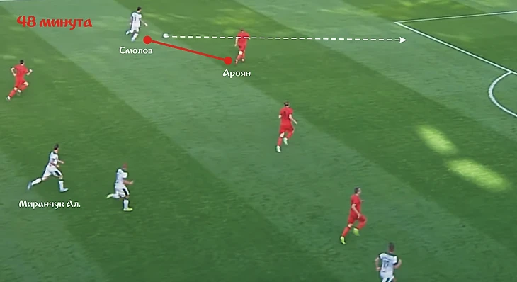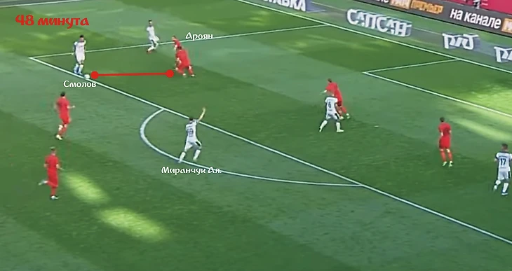 Ароян сопровождает Смолова около 15 метров, но сохраняет дистанцию чуть менее 5 метров. Это видно по полосам травы, каждая из которых около 5,5 метров в ширину. Как так!? Очень просто - их стригут в разном направлении. А как так Ароян не приблизился ближе пяти метров? Да просто Смолов "качнул" защитника - сделал движение вперёд и приостановился для удара, и Ароян уехал вперёд на экспрессе. Удар, но мимо ворот, а вот такой малосущественный футболист как Алексей Миранчук остался без надзора. Наверное, в церковь ходили перед матчем - тоже "защита".