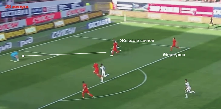 Вот такие дела! Проходной двор во всём своём великолепии. В центре два свободных игрока "Локомотива". Жемалетдинов занял позицию между защитниками, чем полностью освободился от их опеки. Меркулов не пошёл встречать Игнатьева, а Емельянов просто слишком медленный, чтобы успеть за темпом атаки нормальной команды.