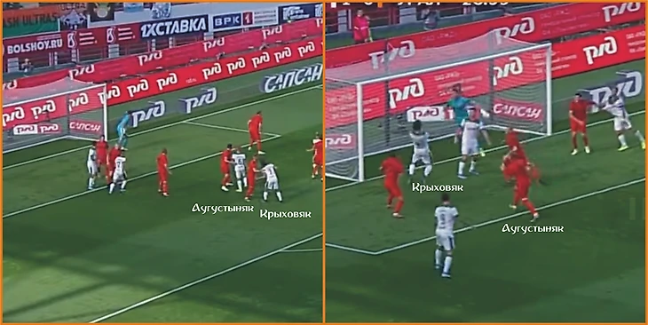 Алексей Миранчук делает заброс на Смолова, которого вот так, как видим, держит Ароян. Подсказка: никак. Защитник играет по мячу, что неправильно - надо играть по игроку. Будь заброс точным, Арояну оставалось бы разводить руками и придумывать оправдания в раздевалке после матча. К счастью для него, Миранчук недобросил, и Ароян зацепил мяч, но тут же обнажились другие проблемы.