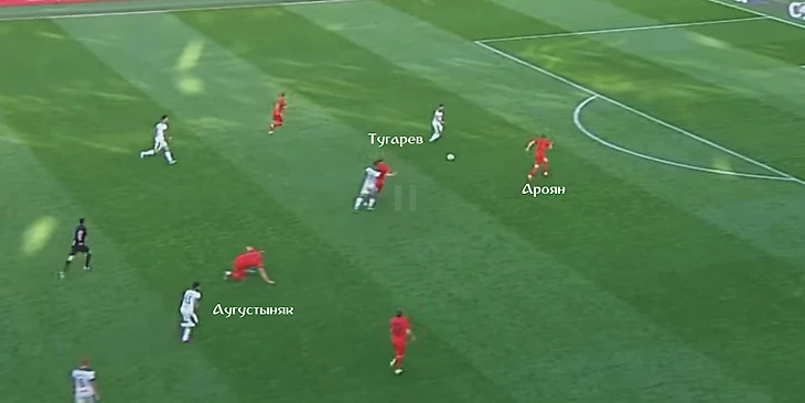 "Локомотив" имел помимо реализованных ещё четыре момента, которые реализовывать надо без оговорок! Четыре, Дмитрий! Вот последний из них. Аугустыняк теряет мяч и падает, пас идёт на свежего Тугарева, к которому направляется Ароян. Увы, такой расклад представляет собой огнеопасное сочетание для "Урала".