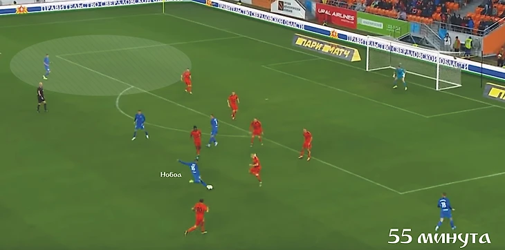 Во втором тайме наметилась равная игра. На кадре видим, как Нобоа решается на удар, хотя слева открыт игрок для заброса. Это для "Урала" обычное дело - крайние полузащитники не торопятся обороняться. Как видим, ни того, ни другого крайнего в кадре нет.