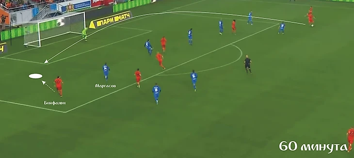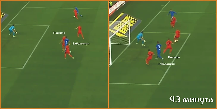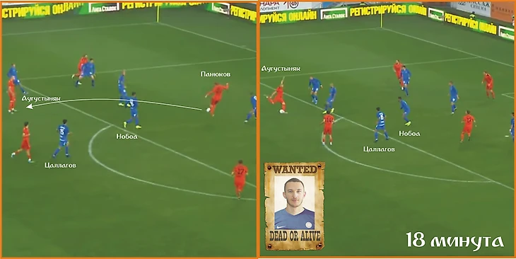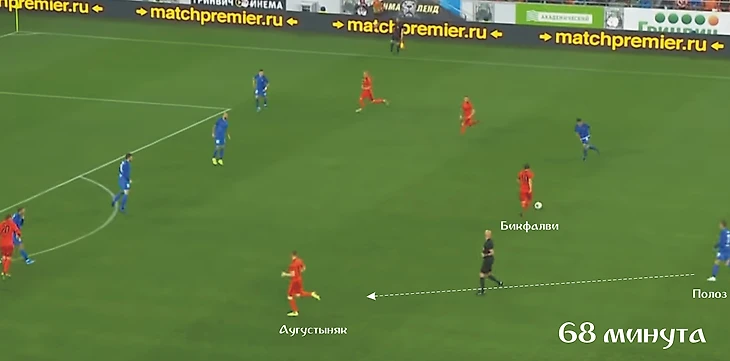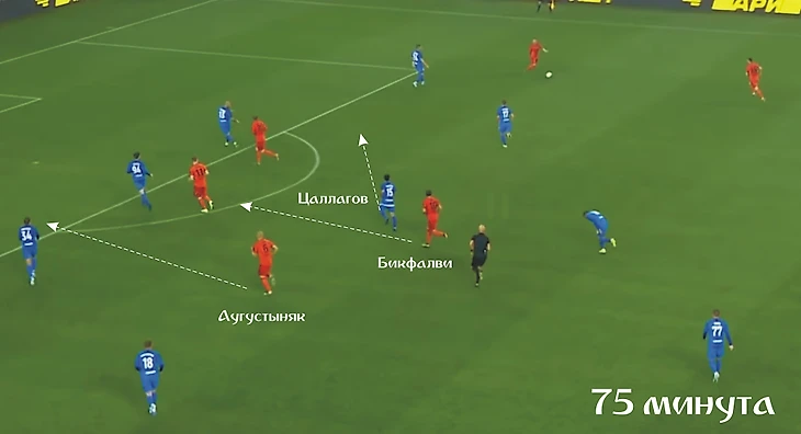 А вот вам и гол за такую безответственную игру в центре. Аугустыняк и Бикфалви неспешно направляются в штрафную, а опорник Цаллагов идёт туда, куда ведомо только ему. И вот, что получается.