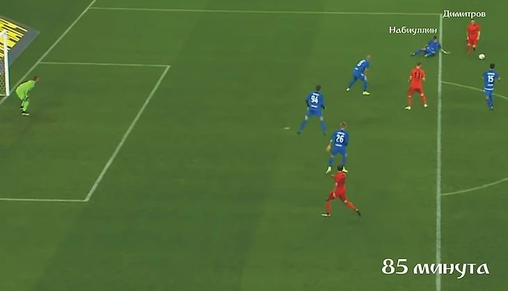 И третий гол. Димитров проходит в центр, Набиуллин, следовавший за ним, решает радикально решить вопрос и делает подкат. На кадре Набиуллин именно делает подкат, а не просто падает без сил, как может показаться. Подкат, по его мнению, надо делать заранее, ещё лучше, наверное, делать его до свистка. Димитров спокойно смещается в центр и мощно попадает в дальний правее от Джанаева. 3:1.