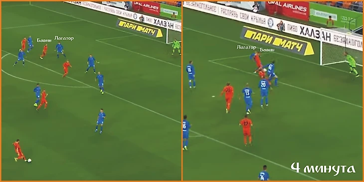 4-я минута и голевой момент. Заброс на Бавина и надо же - он достигает адресата, поскольку Лагатор потерял своего игрока. Но Бавин даже ударить не смог.