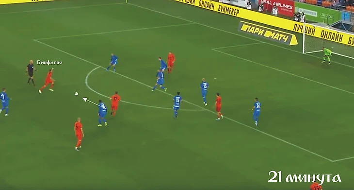 Вновь те же грабли. Димитров отдаёт на Бикфалви, снова в центре полная свобода творчества. Заметим, что и слева, и справа обширные свободные зоны. Кулаков может беспрепятственно войти в штрафную и получить мяч, с другой стороны тоже никого - Бурмистровым покати.Однако румын бьёт и тоже без реальной опасности забить мяч. "Урал" так и не стал использовать такие пространства в нужной мере. Да почему в "нужной"... Ни в какой не использовал, можно сказать. Дай им только ударить, они и рады лупить.