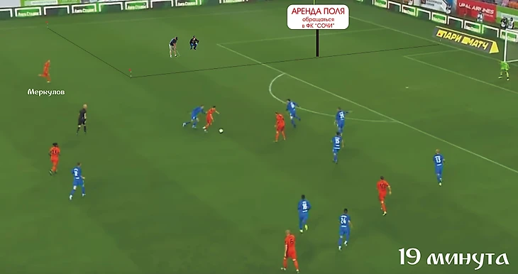 А вот вам момент, когда никого из центральных полузащитников "Сочи" не оказалось на рабочем месте во время атаки соперника. Один ответственный Полоз помчался в оборону. Увы - Бикфалви решил смещаться на правый фланг, хотя ситуация, как видим, диктует другие решения.
