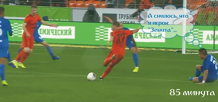 Никто не мешает делать передачу, как никто не мешает бить в ворота. Кудряшов наблюдает и думает только том, что конец месяца и скоро получка. Трое игроков "Урала" в зоне подачи и никто не беспокоится о их действиях. 2:1.