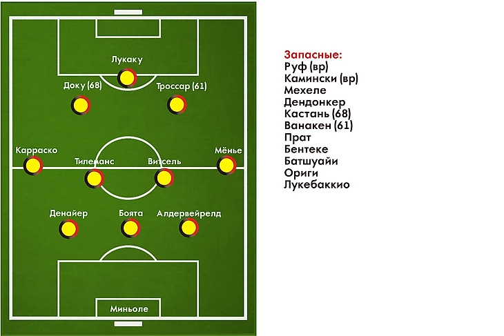 Несмотря на изобилие нападающих, второго форварда сыграл Карраско, что понятно, ибо на роль форварда высокого уровня тянет только Батшуайи, который, к слову, благополучно осел в запасе "Кристал Пэласа" вместе с Бентеке. В беспросветном запасе сидит и Ориги. Скоро вся эта группа нападающих, потеряв место в основе своих клубов, может не найти себя и в заявке на Евро на фоне прогрессирующих Троссара и Доку. Как увидим дальше, именно 25-летний Троссар, только ставший основным игроком "Брайтона", и 19-летний Доку, ныне игрок "Ренна", вышли в основе на матч с Исландией. Пора Батшуайи и его друзьям по лавке искать новые клубы или на Евро они поедут только для дружеской поддержки. В заявке у Бельгии примерно два спорных места в нападении, и они сейчас явно за Доку и Троссаром.