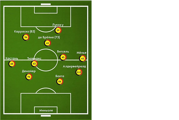 Тройка защитников Денайер-Боята-Алдервейрелд сейчас безальтернативна. Впрочем, Вертонген в строй вернулся, посему, думается, Боята сядет на лавку в следующих матчах. Слева вышел правый защитник Кастань, потому что оказывается, что в отсутствие Торгана Азара весомой замены на левом фланге нет. Также, если ранее Бельгия играла с де Брейне ближе к опорной зоне, то в отсутствие крайних нападающих Азара и Мертенса, в нападении Бельгия стала играть в два форварда - Лукаку и Карраско, а де Брёйне сыграл под ними.