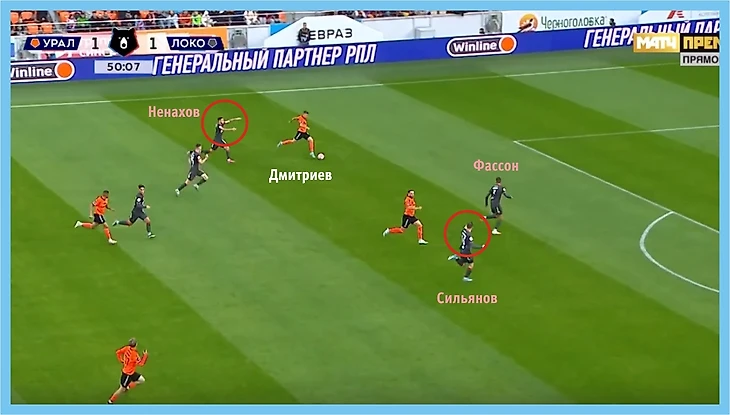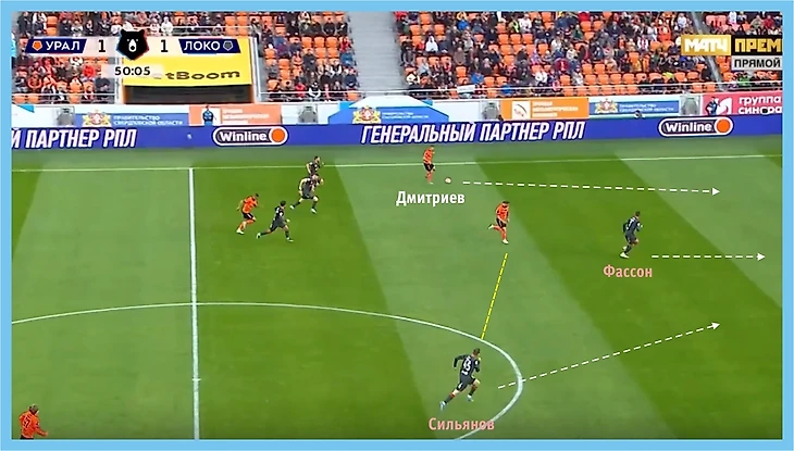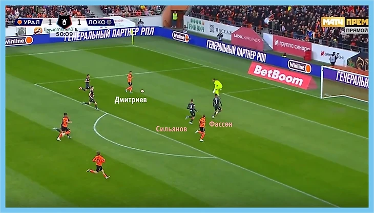 Защитники и без того бессменные, так ещё и играют вот так... Дмитриев несётся по флангу. Что что, а нестись по полю он умеет хорошо в отличие от всего прочего. Фассон должен брать Дмитриева, а Сильянов уже видит, что ему надо следить за Бикфалви.