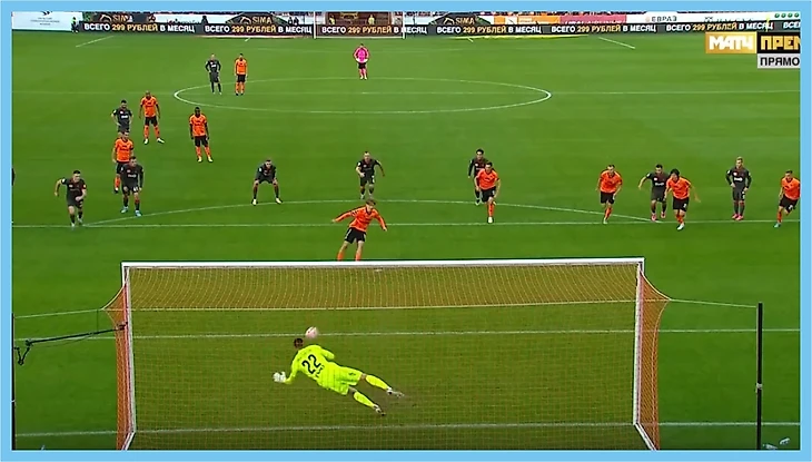 Решение - перебить! Снова Ишков идёт к мячу! Все в шоке. Есть возможность выиграть матч у сильной богатой команды, а тут пацан идёт бить да ещё после первого промаха. Ну, конечно, Ишков не попадает и во второй раз. Снова бьёт в тот же угол (кадр выше).