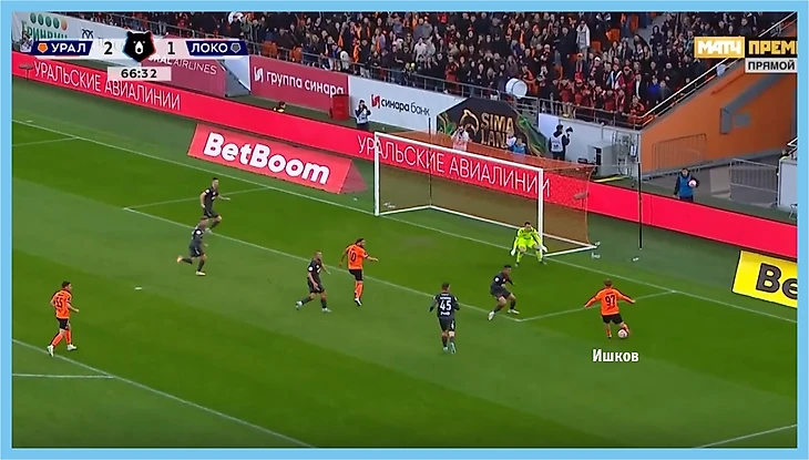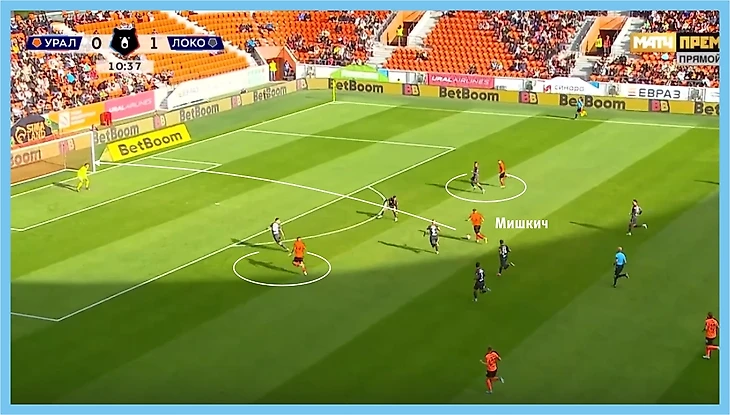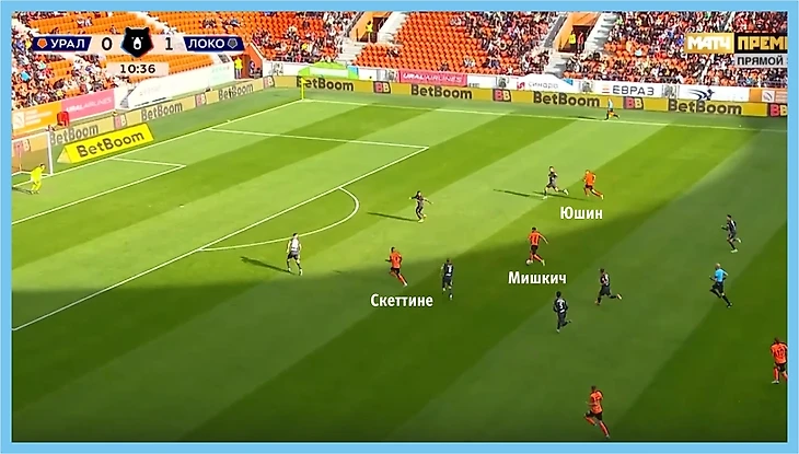 Опасный момент возник у «Урала» после перехвата мяча. Мишкич двигается по центру. Скеттине и Юшин как будто бы могут выйти на удобную позицию для принятия мяча.