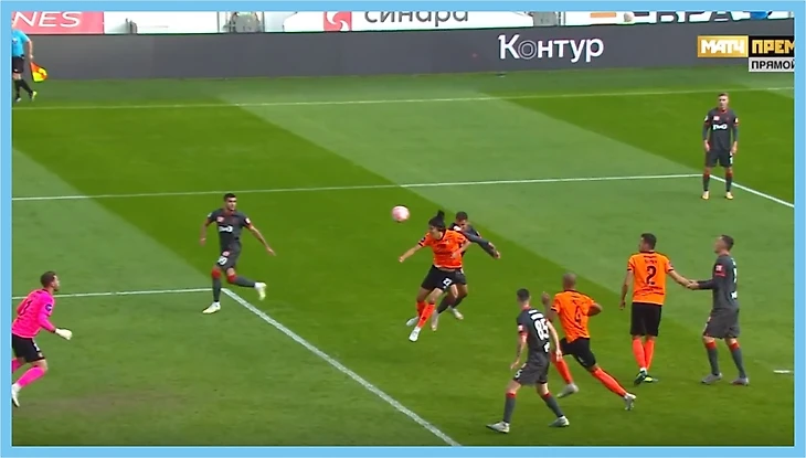 Внимательно посмотрим на кадр выше и увидим, что Бевеев был единственным, кто следил за позицией Сулейманова. Причём Бевеев вышел на замену во втором тайме и всё, что от него требовалось - лечь костьми и не давать гостям ходить в атаку и забивать голы. Но такая самоотдача явно не конёк этого защитника.