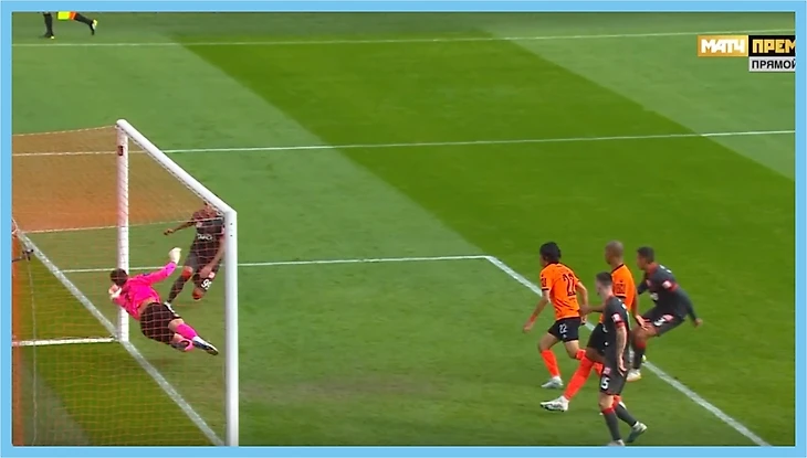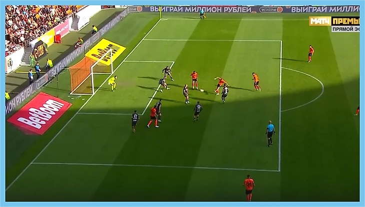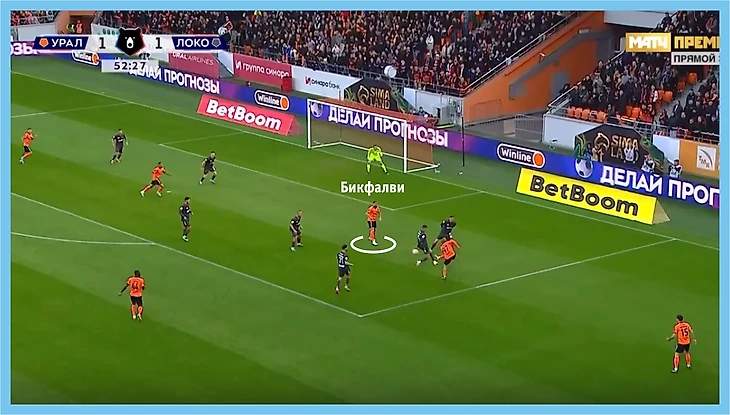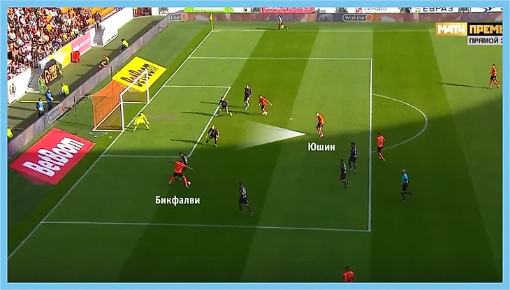 Скоро образуется новый момент у ворот гостей. Защитники сдвоились, и Бикфалви остался один. Как ранее на 18-й минуте Эммерсон вовремя не взял Тикнизяна, так и сейчас Баринов вовремя не реагирует на Бикфалви.