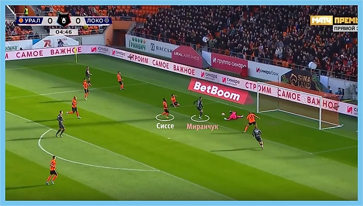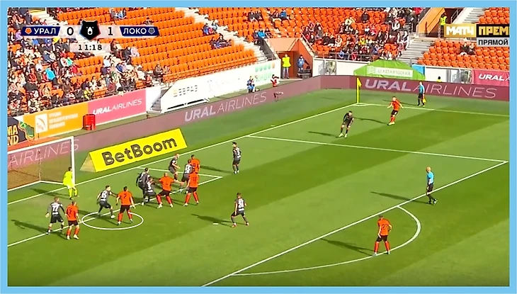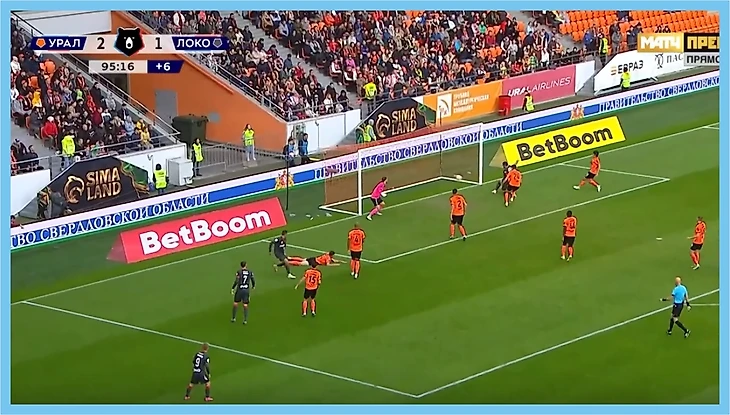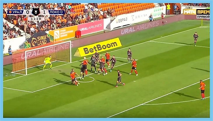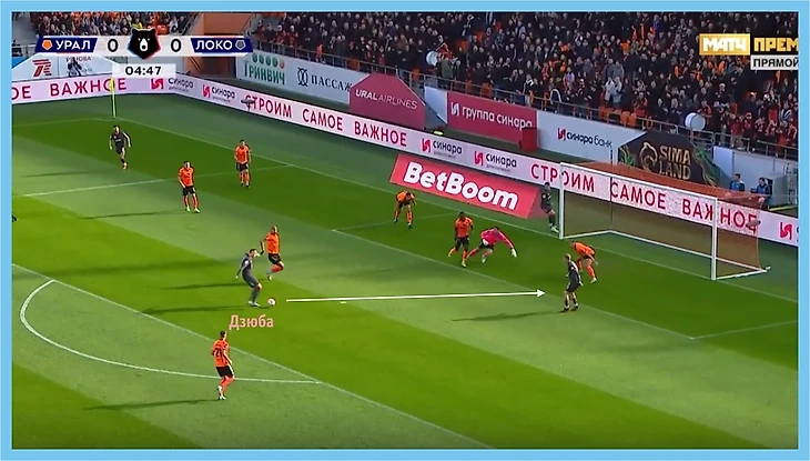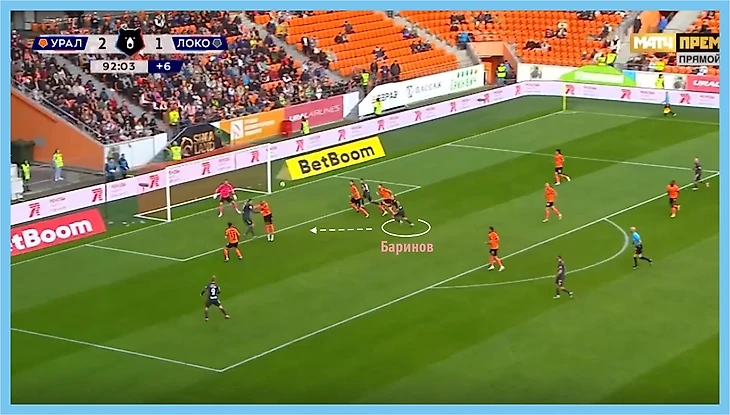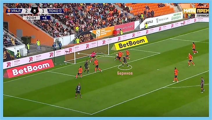 Ниже на 93-й минуте Баринов опережает защитников «Урала» после подача с фланга.