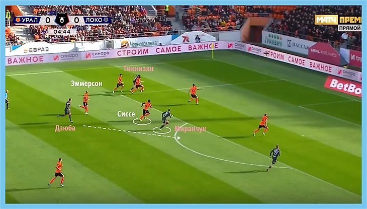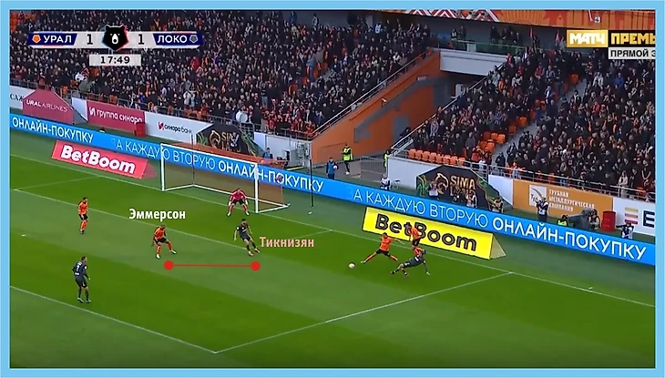 Скоро «Локомотив» мог вернуть зрителям мысль о неизбежности победы гостей, и снова этому помог Эммерсон. Мы видим, как два защитника «Урала» вышли на Самошникова, а Тикнизян сместился в центр. Эммерсон раздваиваться не умеет, но выбор сделать обязан и правильный выбор - закрыть наиболее опасного Тикнизяна. В этом эпизоде ошибся и ещё защитник, который должен был смещаться за Тикнизяном. В итоге опасный удар у нападающего «Локомотива» получился, а гол - нет.