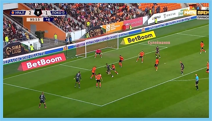Сулейманов находится в полном одиночестве. Вместо того, чтобы играть в футбол, защитники подсознательно ждут свисток - тем паче времени осталось меньше минуты. Размышляют, мол, толпой встанем по позициям плотнее, всё нормально, гола не будет. Нет. Будет.