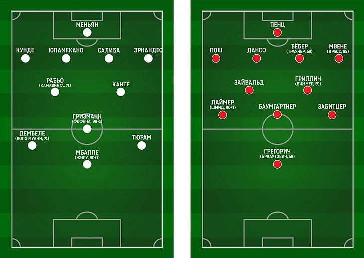 Ждём от Дешама перемен. Дембеле с Тюрамом на лавку, Мбаппе на фланг. Килиан в самом конце сломал себе нос, ударившись в плечо Дансо. Но, надо полагать, играть дальше будет.