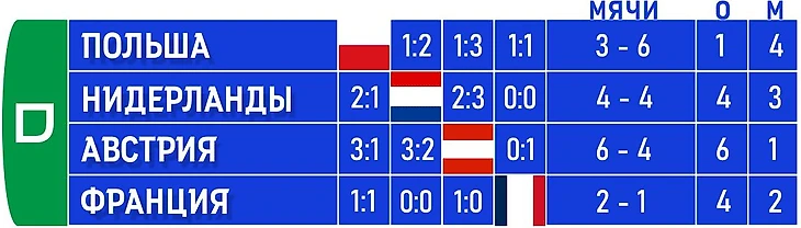 Нидерланды - Австрия 2:3 Гакпо (Симонс), 47; Депай (Вегорст), 75 - Мален, 6 (А); Шмид (Гриллич), 59; Забитцер (Баумгартнер), 80.