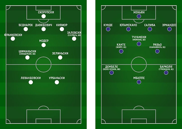 Левандовски достаточно выздоровел, чтобы сыграть полный матч. Ещё у Польши появился новый вратарь и не хуже прежнего. Франция же обновилась на одну позицию - наконец убрали Тюрама, Мбаппе вышел в центре, а слева играл Барколя.