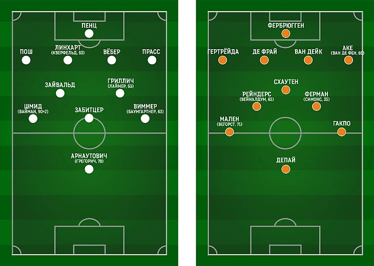 Австрия снова поменяла пару защитников и группу атаки. Нидерланды вдруг выпустили Гертрёйду, и снова нового правого нападающего. На сей раз Куман попал лучше некуда - Мален забил своим, а чужим почти и не угрожал. Приём, Куман! Фримпонг - и никаких гвоздей!