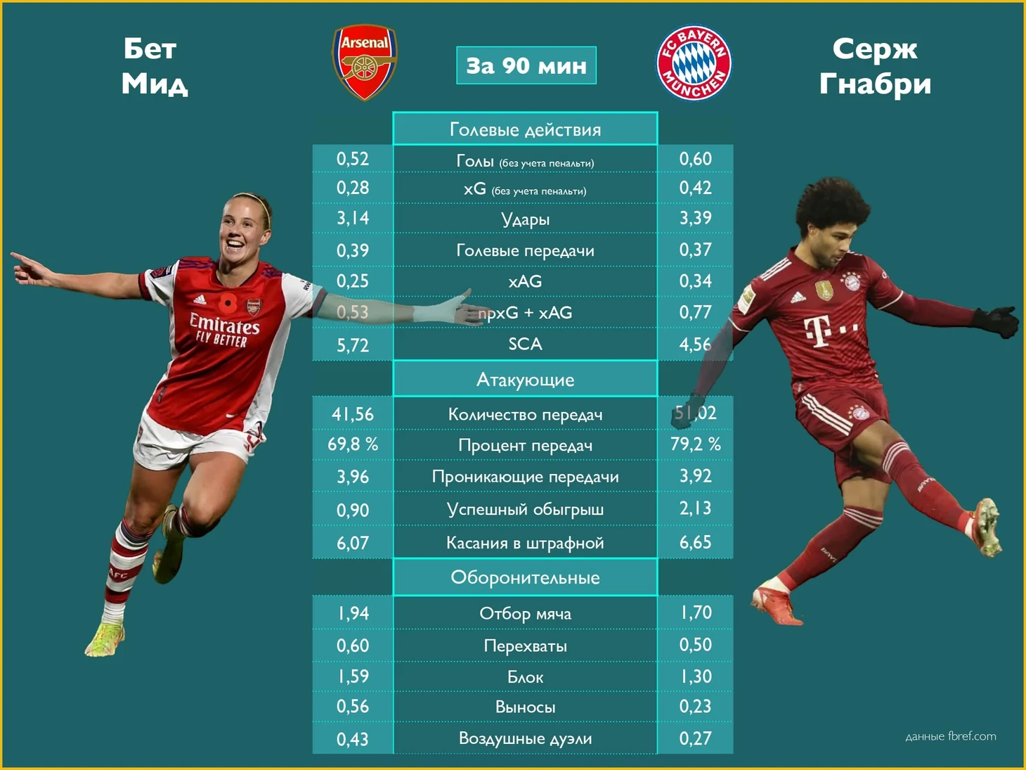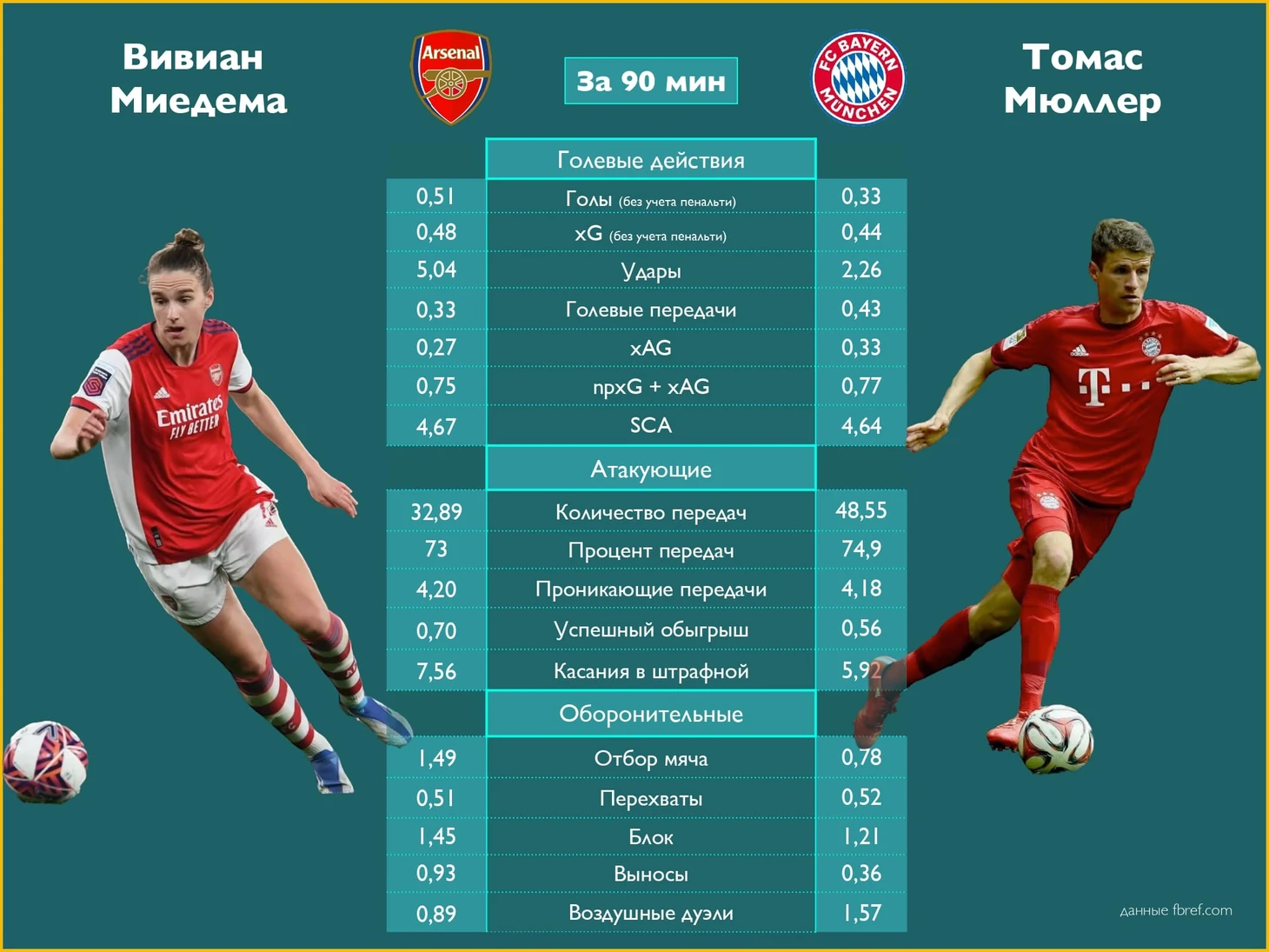 При этом термины «зрелищность» и «техничность» можно оцифровать в количество голов, обводок, передач и т. д. И мы решили посмотреть на зрелищность и техничность через показатели топ-футболисток за последний год, а для наглядности взять еще показатели топ-футболистов, играющих на схожих позициях. Так как у женских команд в сезоне сильно меньше матчей, чем у мужских, мы брали футболистов со схожим количеством сыгранных минут, чтобы было честно.
