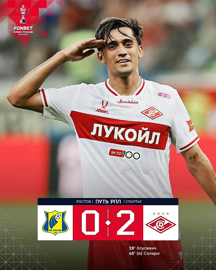 30 июля в Ростове прошёл первый кубковый матч в сезоне для Спартака и закончился он очень удачно. Благодаря голам Хлусевича и Солари московский клуб одержал уверенную победу со счётом 0:2, что позволило им выйти на первое место в своей группе ( В параллельном матче Динамо Махачкала одержали победу над Пари НН со счётом 1:0).