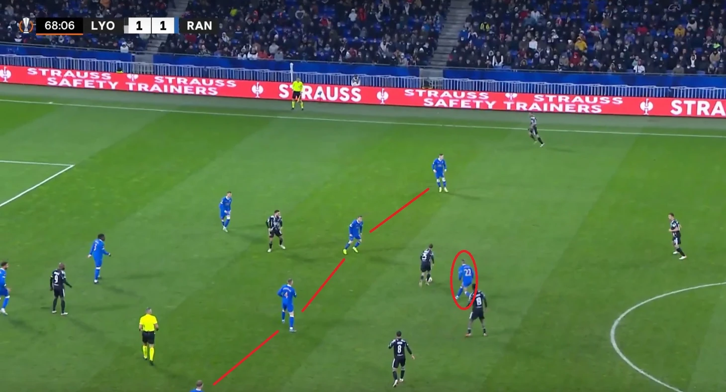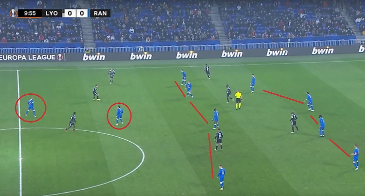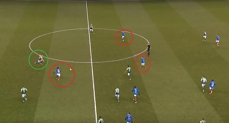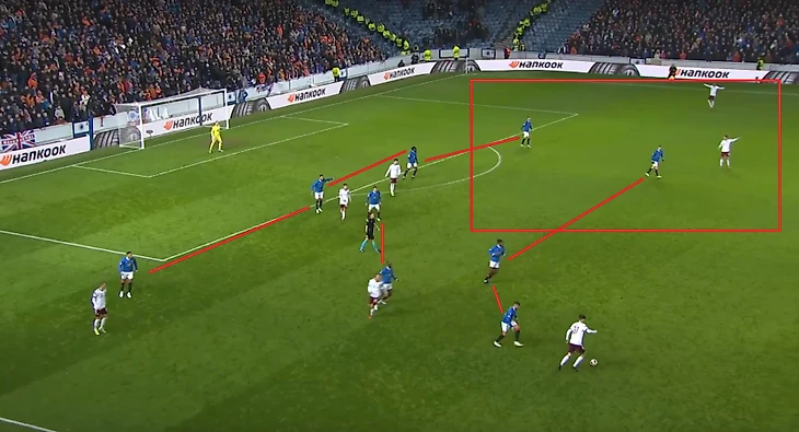 В отличие от команды Джеррарда, прессинг начинается не после потери мяча, а после триггера — плохой обработки мяча игроком соперника, неточной передачи, численном преимуществе и т.д.