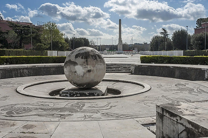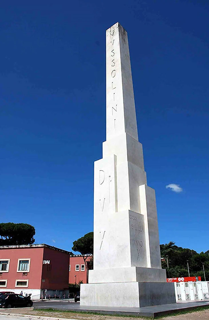 В центре Форума стоит 17-метровый 300-тонный Обелиск Муссолини из ценного каррарского мрамора – крупнейший монолит, выпиленный в XX веке (в его транспортировке участвовали 80 быков) и трибьют Муссолини как основателю новой итальянской империи и преемнику римских правителей. Прямой путь от обелиска к Олимпийскому стадиону проходит через фонтан, 42-тонная сфера в центре которого «символизирует силу фашизма», а дорога выложена мозаиками, на которых античная иконография встречает сюжеты новейшей итальянской истории и современную военную технику, фашистскую символику и надписи вроде «Дуче» (вождь), «Наш Дуче», «Дуче, нашу юность Вам посвящаем» и им подобные.
